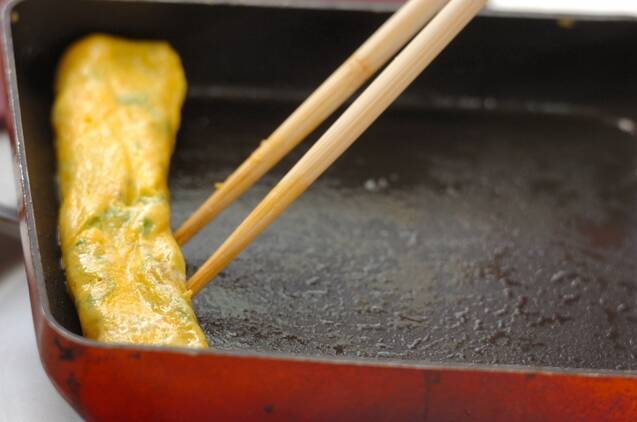 卵焼き器を中火で熱し、サラダ油を薄くひき、(2)の1/3量を流し入れて全体に広げる。周りがかたまってきたら奥側から手前に巻き、巻き終わったら奥側へ寄せる。