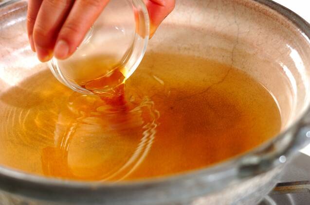 土鍋を火にかけ、沸騰する直前で花かつおを入れ、1分煮て火を止める。花かつおが沈むまでしばらく置き、ザルで漉して再び土鍋に入れ、ナンプラーを加える。