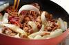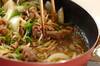 豚肉に火が通ったらモヤシ、ピーマンを加えて炒め合わせ、<調味料>を加えてしんなりするまで炒め合わせる。
