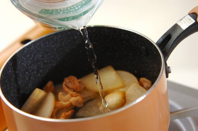 鍋に分量外のサラダ油を中火で熱し、ニンニク、豚肉、大根を炒め合わせる。全体に油がまわったら、水、酒を加える。