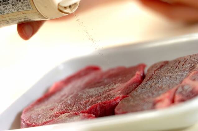 牛ステーキ肉は常温にもどし、塩コショウを両面に振る。