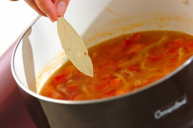 中火で熱した鍋にオリーブ油をひき、玉ネギ、ショウガ、ベーコンを炒める。トマトを加え、水と固形スープの素、ローリエを入れる。