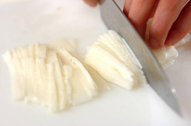 長芋は皮をむいて横半分に切り、キッチンペーパーなどでぬめりを拭き取り、縦せん切りにする。(ヒント)スライサーで薄切りにして切るとせん切りにしやすいですよ!
