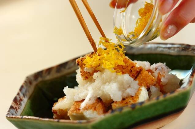 (1)とカブを和えて器に盛り、ユズ皮を散らしてしょうゆを添える。