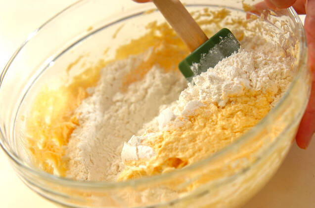振るっておいた薄力粉とベーキングパウダーを2回に分けて加えて、ゴムベラで、粉気がなくなるまでサックリ混ぜ合わせる。牛乳を半量ずつ加えてサックリ混ぜ合わせる。