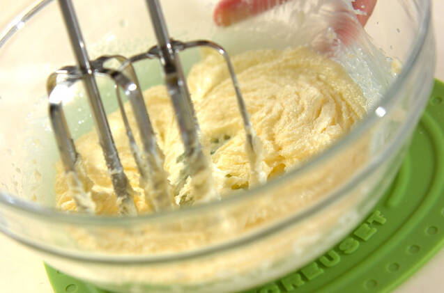 <生地>を作る。無塩バターをボウルに入れて、ハンドミキサーでクリーム状になるまで混ぜる。砂糖を加え、白っぽくなるまで混ぜる。