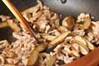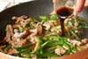 フライパンにゴマ油を強火で熱し、豚肉、水切りしたゴボウを加え、ゴボウがしんなりすればピーマンを加えて炒め合わせる。