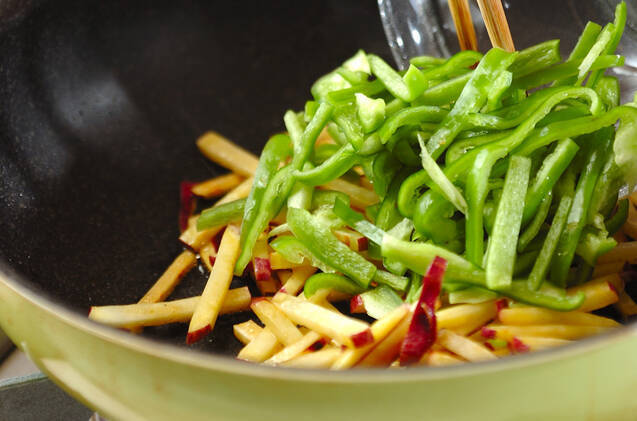 フライパンにゴマ油を強火で熱し、水気をきったサツマイモを炒め、少し色が変わってきたらピーマンを加えて炒め合わせる。