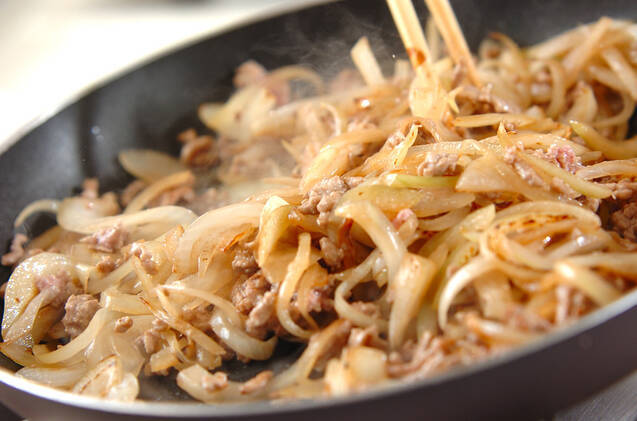 フライパンにサラダ油を強火で熱して玉ネギを炒め、少し茶色になったら豚ひき肉を加え、ポロポロになるまで炒め合わせる。さらにキャベツ、赤ピーマンを加えて炒め合わせ、しんなりしたら<調味料>の材料を加えて炒め合わせる。