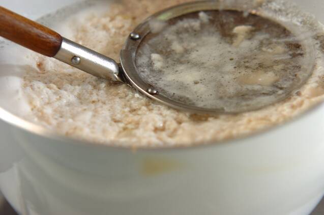 鍋に<スープ>の材料を入れて、中火にかける。煮たったら火を弱め、アクを取る。10分ほど煮て、ニンニク、ショウガは取り出し、火を止める。