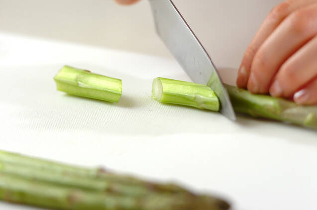 グリーンアスパラの根元の固い部分は切り落とし、ピーラーで根元の固い皮を薄くむき、長さ3~4cmの斜め切りにする。