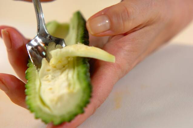 ゴーヤは種を取り、薄切りにしてサッと熱湯でゆでる。白ネギはみじん切りにする。