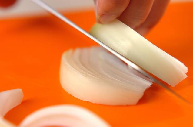 玉ネギは幅1cmのくし切りにする。