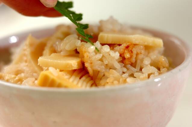炊き上がったら10分蒸らし、底からサックリと混ぜて器によそい、木の芽をのせる。