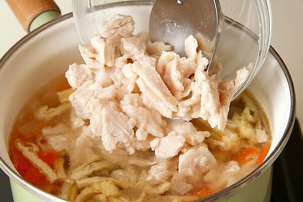 1の鍋に板コンニャク、油揚げ、2の酒粕をだしごと加えて酒粕が煮溶けるまで煮る。
