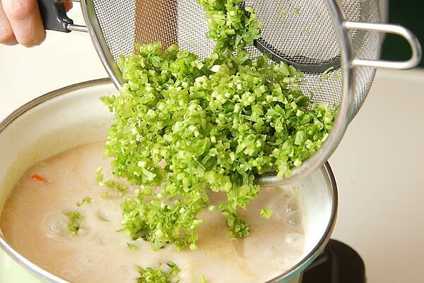 刻みセリを加えてひと混ぜし、薄口しょうゆで味を整え、器によそい、お好みで七味唐辛子を振り掛ける。
