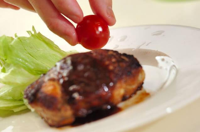 ハンバーグにドライパセリを散らし、付け合わせの野菜を添える。