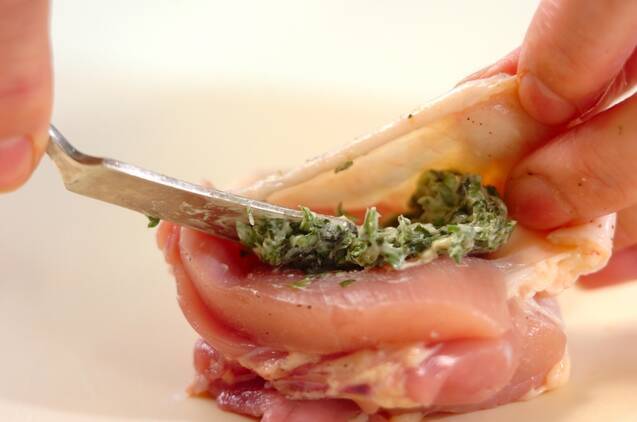 <バジルバター>のバジルを粗みじんに切り、パセリと一緒にバターとよく混ぜる。鶏もも肉の皮の片端を残して皮をめくり、<バジルバター>を身と皮の間にはさむ。