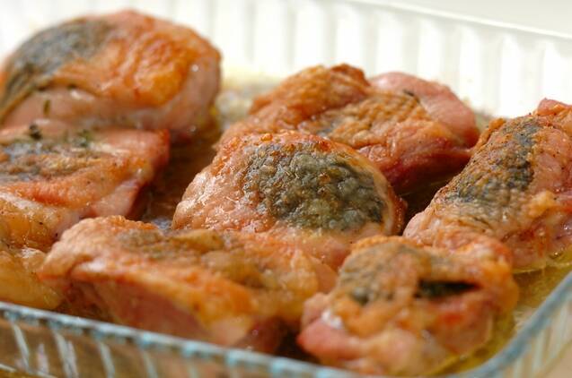 皮を上にしてオーブン皿に並べ、200℃に予熱しておいたオーブンで15~20分、焼き色がつくまで焼く。器に盛り付け、プチトマトを飾る。