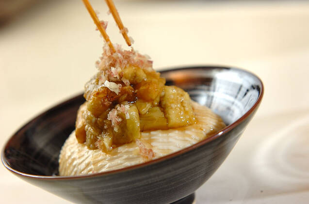 ボウルに(2)と<調味料>の材料を入れ、混ぜ合わせる。水気をきったザル豆腐を器に盛り、ナスをのせてミョウガを散らす。