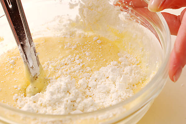 卵を溶きほぐし、砂糖、牛乳を混ぜ合わせホットケーキミックス、溶かしバターを混ぜ合わせる。