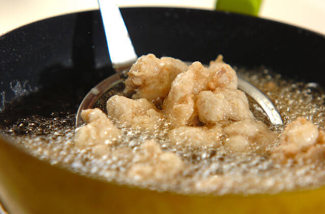 鶏軟骨に薄く片栗粉をからめ、170℃の揚げ油に入れてカラッと揚げ、油をきる。