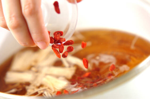 <調味料>の材料、クコの実を加えて火を止め、器に注ぐ。