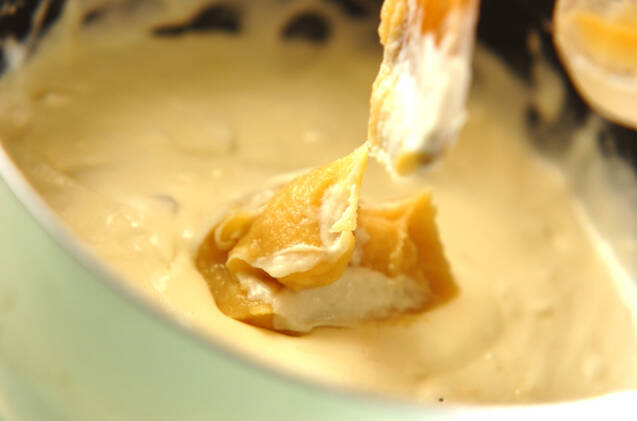 鍋に白ワイン、だし汁を入れて火にかけ、沸騰させて火を止める。混ぜ合わせておいたクリームチーズ、グリュイエールチーズを少しずつ加えて溶かし、白みそも加えて混ぜ合わせる。さらに(1)も加えて混ぜ合わせる。滑らかになったら再び加熱する。