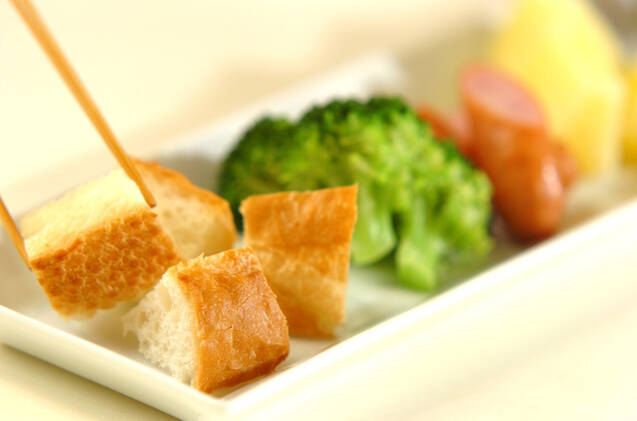 下準備したジャガイモ、ブロッコリー、バゲット、生麩、ウインナーソーセージを器に盛って(2)に添える。