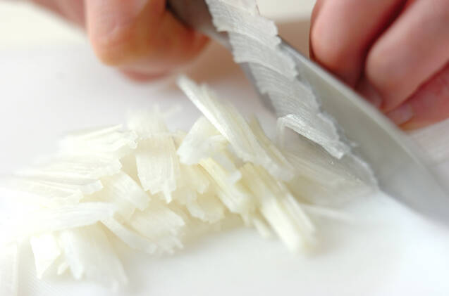 鍋に<スープ>の材料を入れて強火にかける。大根は縦せん切りに、白菜は細切りに、白ネギは斜め薄切りに、玉ネギは縦薄切りに、ニンジン、ショウガもせん切りに、ハムも細切りにする。