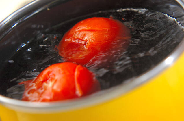 トマトはヘタをくり抜き、サッと熱湯につける。冷水に取って皮をむいて水気を拭き取り、切り離さない程度の深さまで十字に切り込みを入れる。