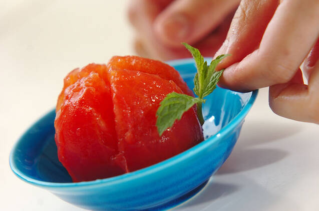 器にトマトをのせ、保存容器に残った白ワインをかけ、ミントの葉を添える。