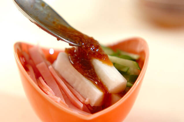 器に長芋、キュウリ、ハムを盛り合わせ、食べる直前に<ドレッシング>をかける。