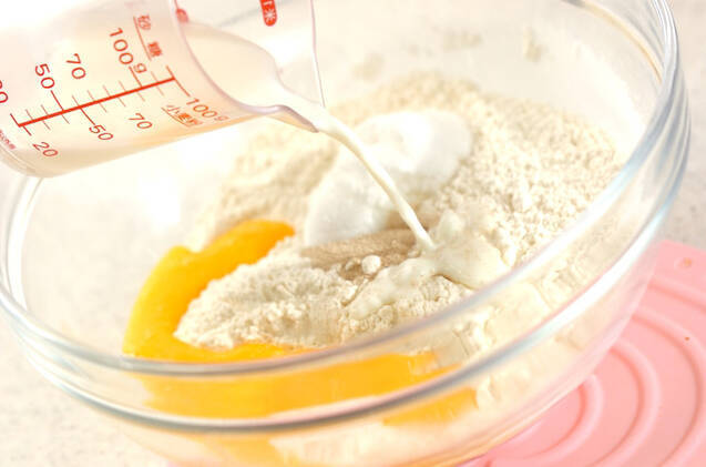 ボウルに強力粉を入れ、インスタントドライイースト、砂糖を真ん中におく。溶き卵1個分、塩をはしにおき、温めた牛乳40~50mlをかけ、カードでひとまとまりになるまで混ぜる。