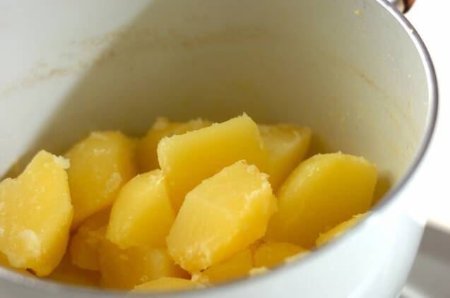 煮たったら火を弱めてゆで、火が通ったら湯を捨て、鍋を中火にかけてゆすりながら粉ふきイモにする。