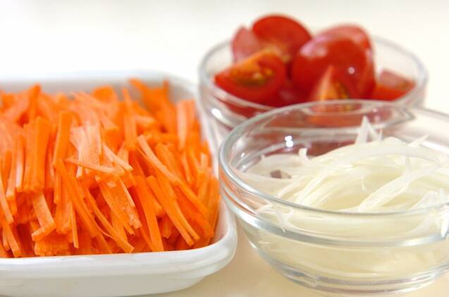 春ニンジンは長さ4cmの細切り、玉ネギは薄切りにする。プチトマトはヘタを取り、4等分に切る。