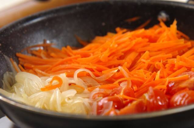 鍋に(1)の煮汁と(2)を入れ、蓋をして蒸し煮にする。水分が足りなければ水を適量加える。仕上げに塩コショウで味を調える。