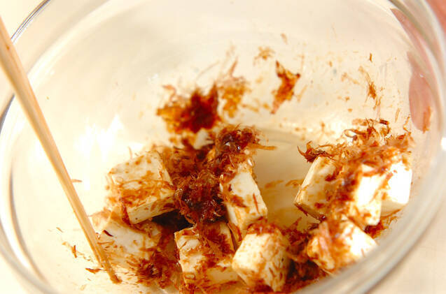 ボウルにかつお節としょうゆを混ぜ合わせ、クリームチーズを和え、キュウリと共に器に盛る。