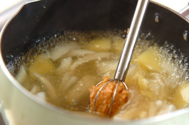 鍋にだし汁、ジャガイモ、玉ネギを入れて強火にかけ、煮たったら火を弱める。ジャガイモが柔らかくなったら、合わせみそを溶き入れ、最後に刻みネギを加えて火を止め、お椀によそう。