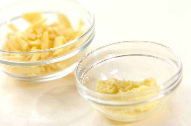 ショウガは皮をむき、半分は2cmくらいの細切りに、残り半分はすりおろしておく。