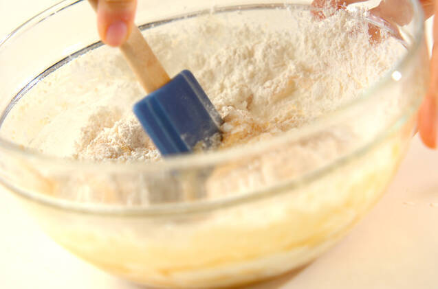 ボウルに卵ときび砂糖を入れ、泡立て器でもったりするまで泡立てる。振るった粉類を加え、泡立て器からゴムベラに変え、サックリ混ぜ合わせる。