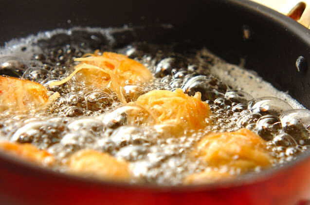 揚げ油に(1)をそっと入れ、おいしそうなキツネ色になるまで揚げて油をきる。続けて、シシトウを入れ、色が鮮やかになったら油から上げて塩コショウを振る。器に揚げもの、トマトを盛り合わせる。