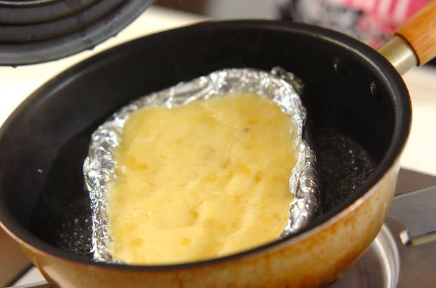 フライパンに2~3cm位お湯を張って(2)を入れ、フライパンに蓋をして中火で20分蒸す。フライパンから取り出し、冷ます。