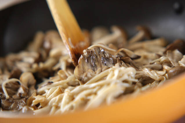フライパンにオリーブ油を中火で熱し、キノコ類を加えて炒め合わせる。