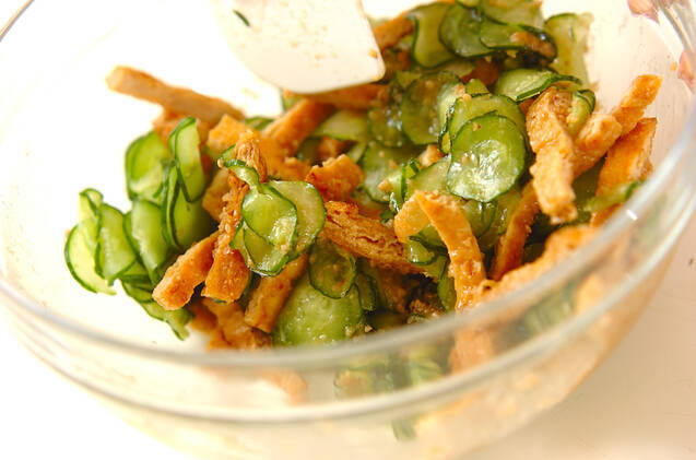 <合わせゴマ酢>にキュウリ、油揚げを加えて和え、器に盛る。