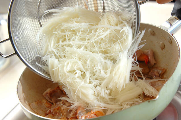 フライパンに残りのサラダ油を中火で熱し、豚バラ肉、エビを加えて炒め合わせる。豚バラ肉の色が変わったら、ビーフンを加えて手早く炒め合わせる。