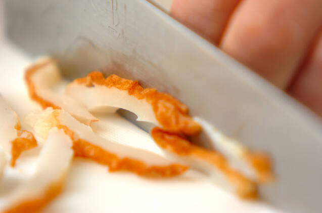 ちくわは縦半分に切って、薄い斜め切りにする。