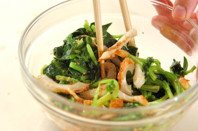 <合わせゴマダレ>のボウルにホウレン草、ちくわを加えて和え、器に盛る。