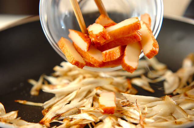 フライパンにサラダ油を熱してゴボウを炒め、しんなりしたらさつま揚げを加えて炒め合わせる。