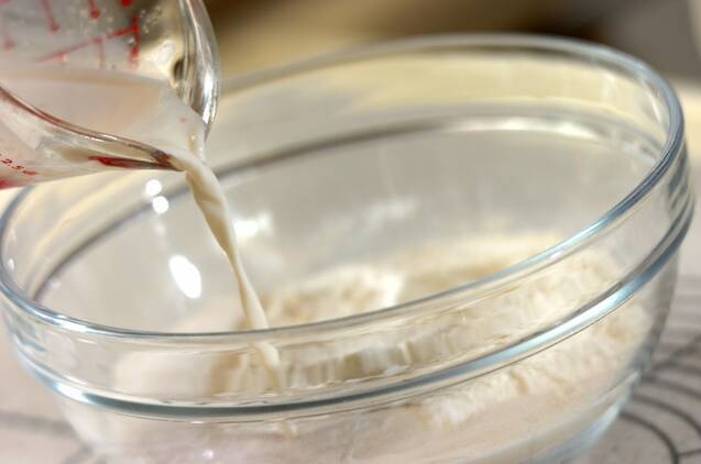 ボウルに強力粉を入れ、壁側に砂糖、その反対側に塩を入れる。イーストを溶かした牛乳を砂糖めがけて注ぎ入れ、続いて溶き卵を加えてゴムベラで混ぜる。
